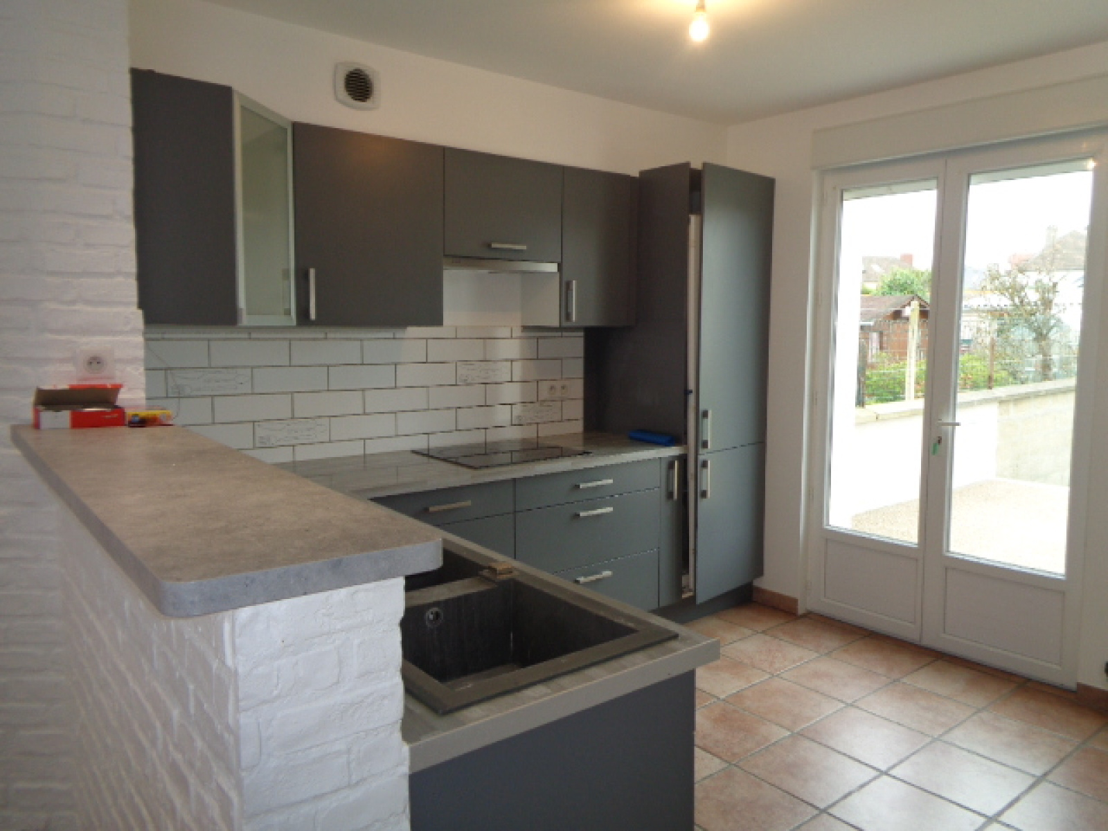 CHERRBOUR EN COTENTIN, Tourlaville Les Flamands, maison non meublée F7 de 99 m² avec jardin et cour fermée comprenant en RDC une cuisine aménagée (four, plaque, hotte, refrigérateur mis à disposition) ouverte sur séjour, salon, une salle d'eau, un Wc et une buanderie.